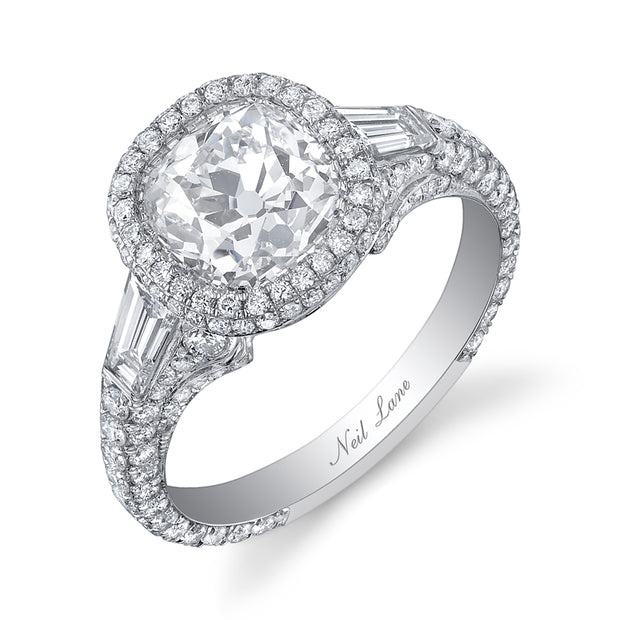 An enchanting handmade platinum Neil Lane ring centers upon a vintage cushion-cut diamond weighing 2.03 cts., G Color & VS1 Clarity. Accented throughout by two baguette-cut diamonds weighing 0.45 ct. and 194 full-cut diamonds weighing 1.06 cts.